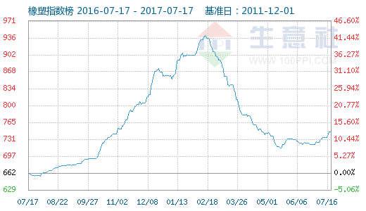 5月份,橡塑大部分产品延续了前两个月走势:继续下行。呈现特点:橡胶全线下行,部分通用塑料翻红;而且平均跌幅继续收窄,从指数上也能印证:橡塑行业指数由5月初的740下跌到月末的732,跌幅仅8点(3月跌幅105点、4月跌幅40点);另一个特点是橡胶跌幅仍强于塑料。一方面,受大宗商品市场低迷以及原油疲软导致的成本端利空影响;更主要的是,需求端缺乏利好,低需求和高库存相互博弈,市场去库存进程仍未结束;另外,经济面来看,2017年5月,生意社大宗商品供需指数(BCI)为-0.19,均涨幅为-1.01%,说明经济继续处于收缩状态,大环境仍偏空为主,诸多因素导致5月份橡塑市场跌多涨少、上行乏力。